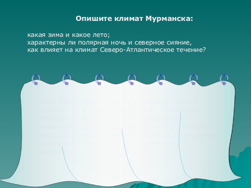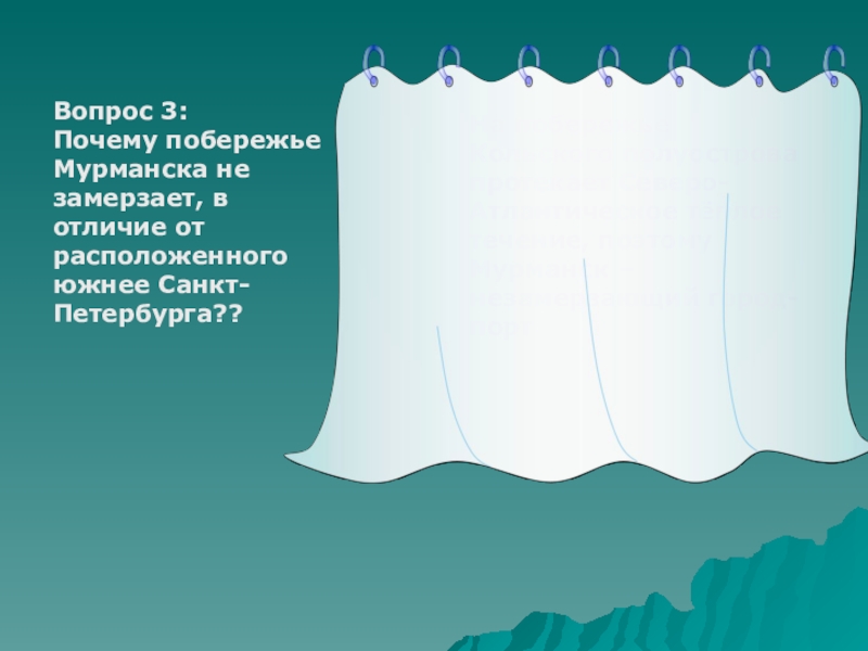 На побережье Кольского полуострова протекает Северо-Атлантическое тёплое течение, поэтому Мурманск – незамерзающий город-порт