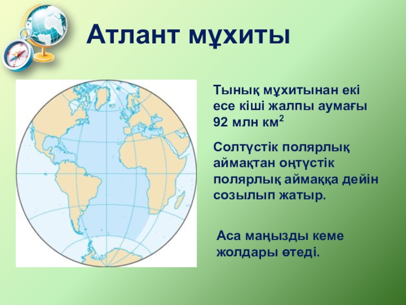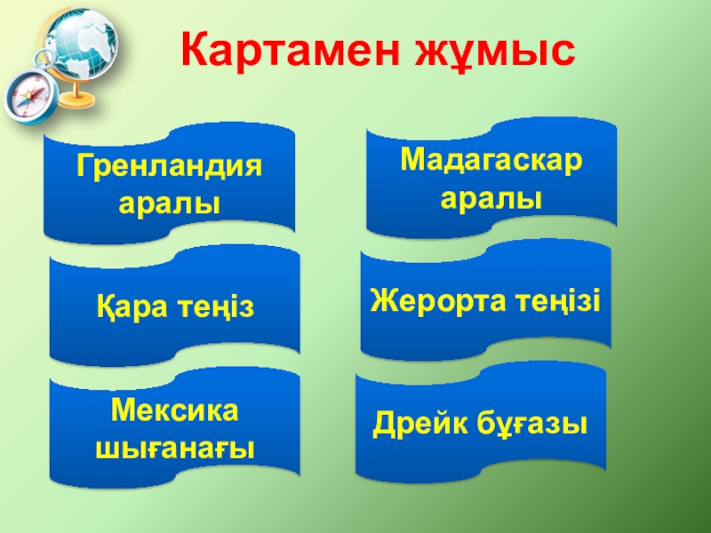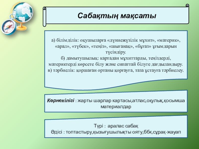 Көрнекілігі : жарты шарлар картасы,атлас,оқулық,қосымша материалдар
