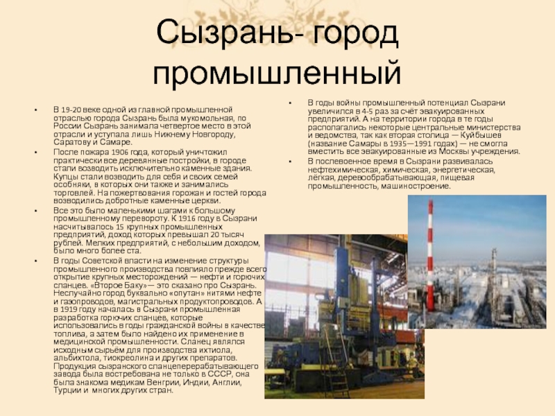 В годы войны промышленный потенциал Сызрани увеличился в 4-5 раз за счёт эвакуированных предприятий. А на территории города в те годы располагались некоторые центральные министерства и ведомства, так как вторая столица — Куйбышев (название Самары в 1935—1991 годах) — не смогла вместить все эвакуированные из Москвы учреждения.