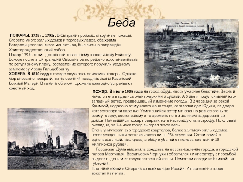 ПОЖАРЫ. 1728 г., 1795г. В Сызрани произошли крупные пожары. Сгорело много жилых домов и торговых лавок, оба храма Богородицкого женского монастыря, был сильно повреждён Христорождественский собор.