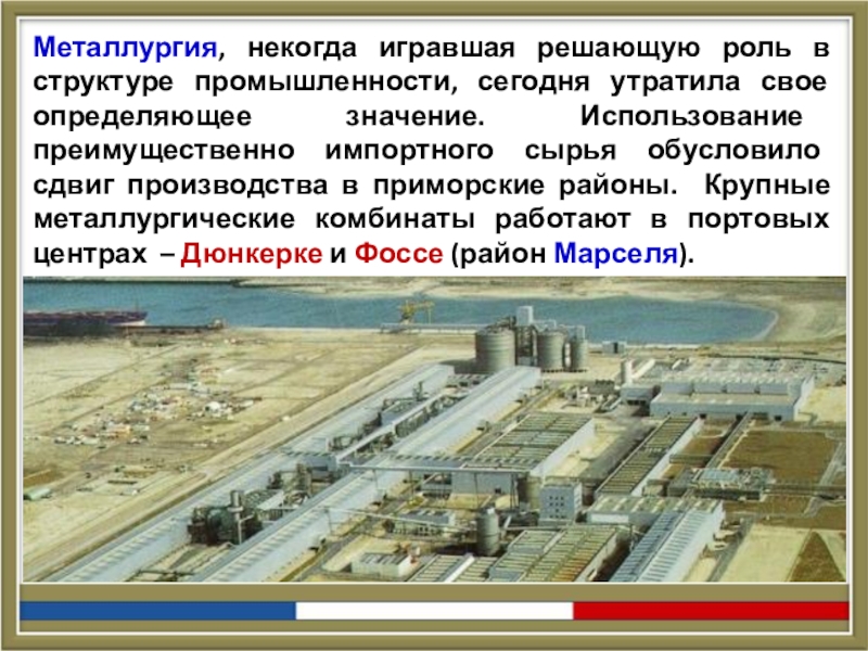 определяющее значение. Использование преимущественно импортного сырья обусловило сдвиг производства в приморские районы. Крупные металлургические комбинаты работают в портовых центрах – Дюнкерке и Фоссе (район Марселя).