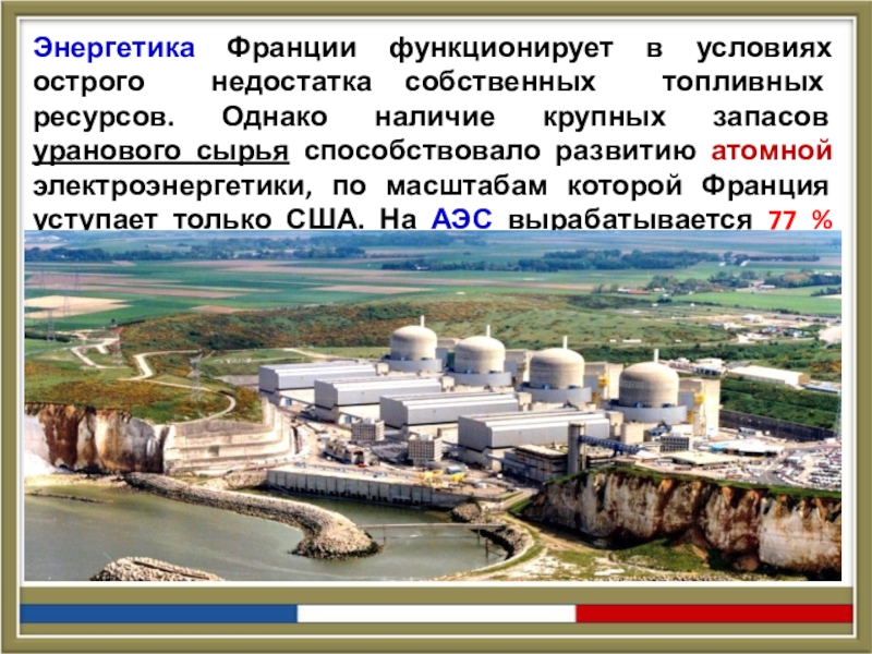 наличие крупных запасов уранового сырья способствовало развитию атомной электроэнергетики, по масштабам которой Франция уступает только США. На АЭС вырабатывается 77 % электроэнергии.