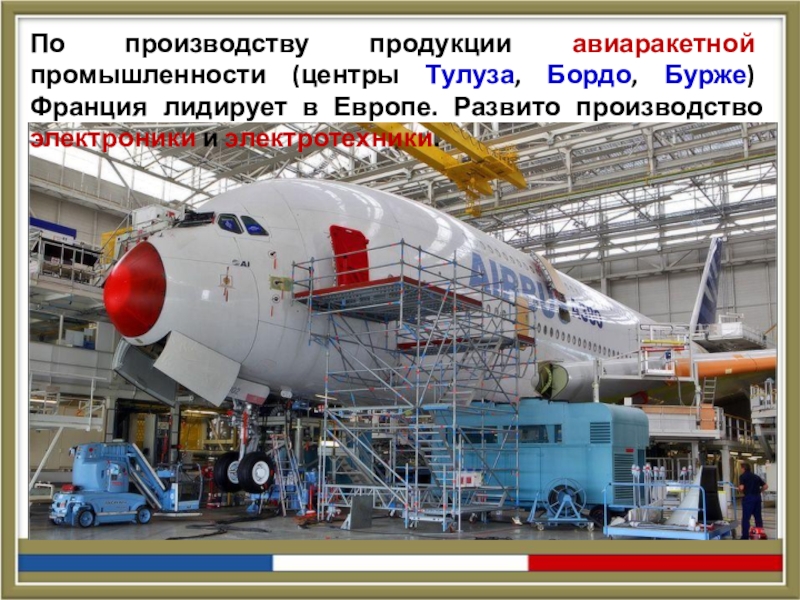 Слайд 17По производству продукции авиаракетной промышленности (центры Тулуза, Бордо, Бурже) Франция лидирует