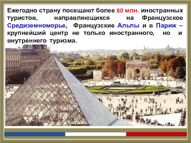 Слайд 28Ежегодно страну посещают более 80 млн. иностранных туристов, направляющихся на Французское