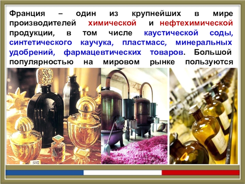 продукции, в том числе каустической соды, синтетического каучука, пластмасс, минеральных удобрений, фармацевтических товаров. Большой популярностью на мировом рынке пользуются французская парфюмерия и косметика.