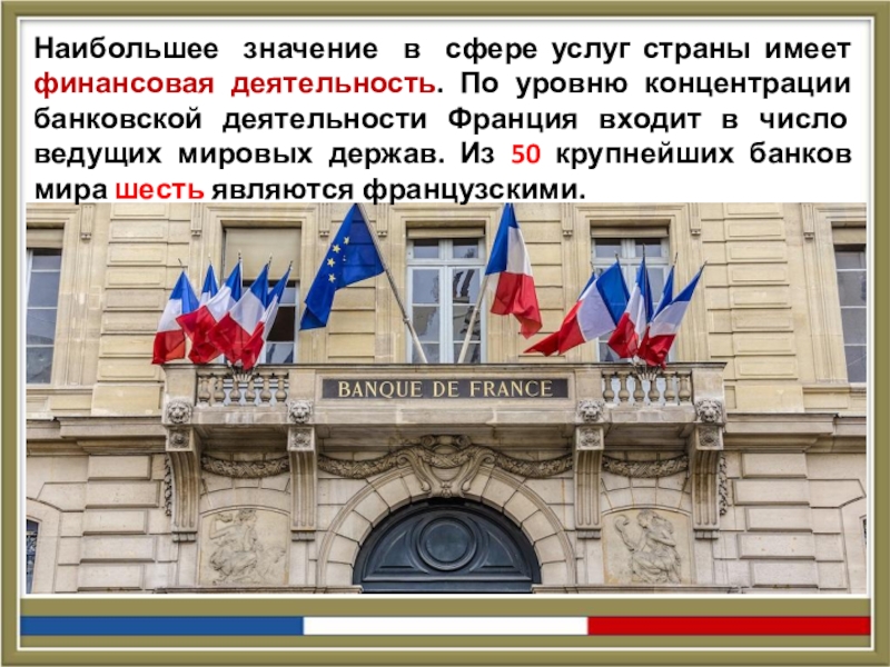 концентрации банковской деятельности Франция входит в число ведущих мировых держав. Из 50 крупнейших банков мира шесть являются французскими.