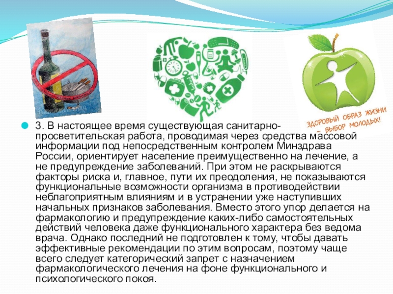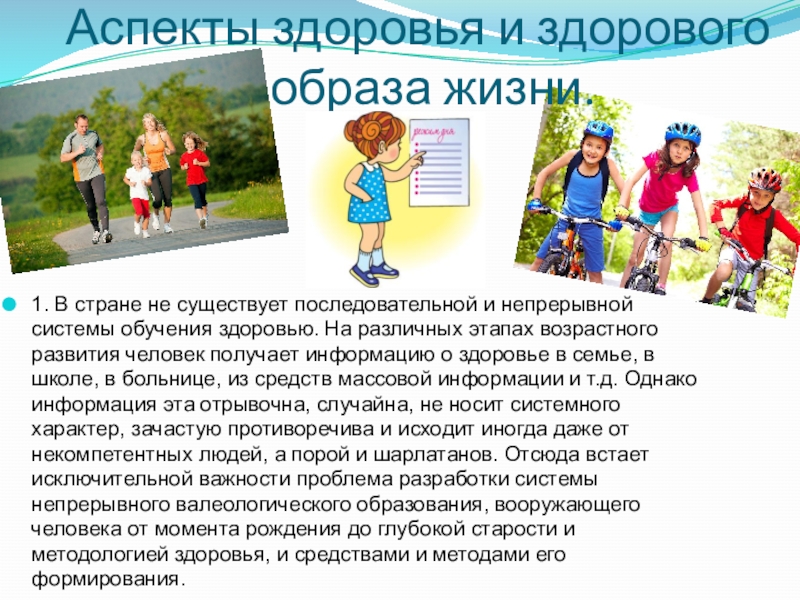 1. В стране не существует последовательной и непрерывной системы обучения здоровью. На различных этапах возрастного развития человек получает информацию о здоровье в семье, в школе, в больнице, из средств массовой информации и т.д. Однако информация эта отрывочна, случайна, не носит системного характер, зачастую противоречива и исходит иногда даже от некомпетентных людей, а порой и шарлатанов. Отсюда встает исключительной важности проблема разработки системы непрерывного валеологического образования, вооружающего человека от момента рождения до глубокой старости и методологией здоровья, и средствами и методами его формирования.