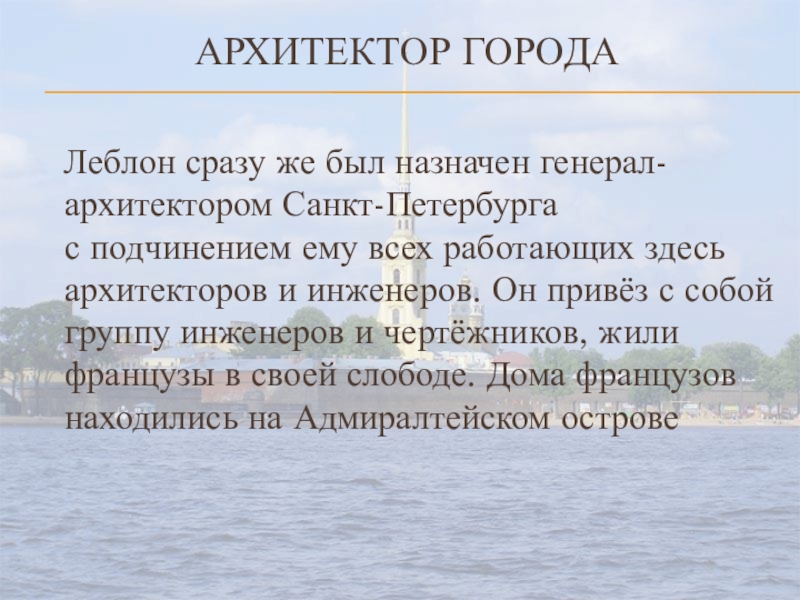 всех работающих здесь архитекторов и инженеров. Он привёз с собой группу инженеров и чертёжников, жили французы в своей слободе. Дома французов находились на Адмиралтейском острове