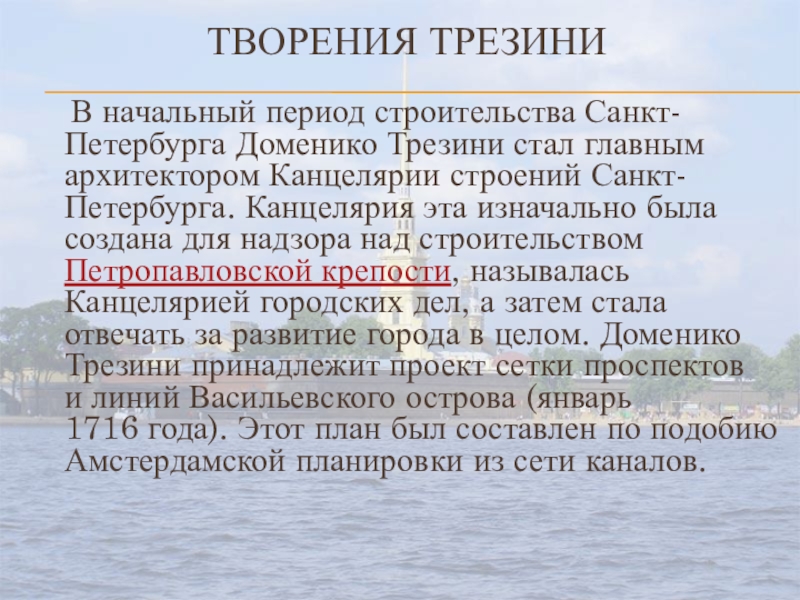главным архитектором Канцелярии строений Санкт-Петербурга. Канцелярия эта изначально была создана для надзора над строительством Петропавловской крепости, называлась Канцелярией городских дел, а затем стала отвечать за развитие города в целом. Доменико Трезини принадлежит проект сетки проспектов и линий Васильевского острова (январь 1716 года). Этот план был составлен по подобию Амстердамской планировки из сети каналов.