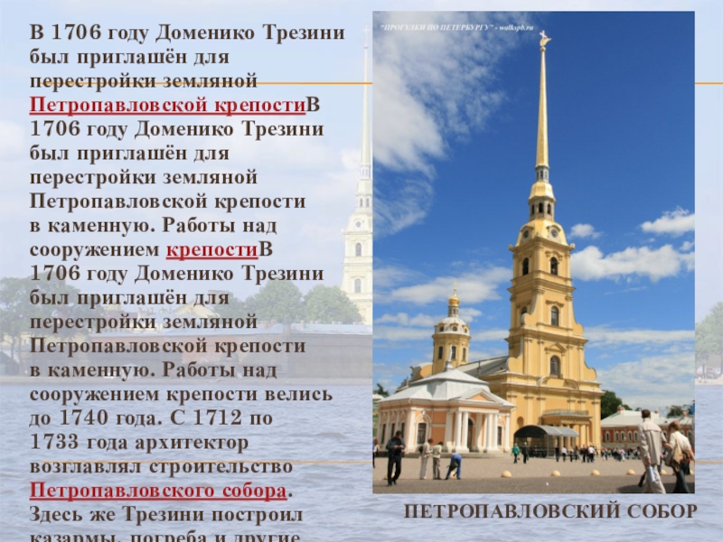 Петропавловской крепостиВ 1706 году Доменико Трезини был приглашён для перестройки земляной Петропавловской крепости в каменную. Работы над сооружением крепостиВ 1706 году Доменико Трезини был приглашён для перестройки земляной Петропавловской крепости в каменную. Работы над сооружением крепости велись до 1740 года. С 1712 по 1733 года архитектор возглавлял строительство Петропавловского собора. Здесь же Трезини построил казармы, погреба и другие постройки. Постройкой крепости и собора Доменико Трезини внёс огромный вклад в развитие русской архитектуры. Он применил здесь принципиально новые для России того времени принципы строительства.