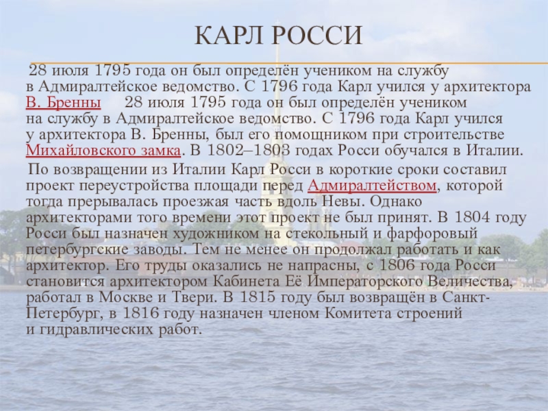 ведомство. С 1796 года Карл учился у архитектора В. Бренны 28 июля 1795 года он был определён учеником на службу в Адмиралтейское ведомство. С 1796 года Карл учился у архитектора В. Бренны, был его помощником при строительстве Михайловского замка. В 1802–1803 годах Росси обучался в Италии.