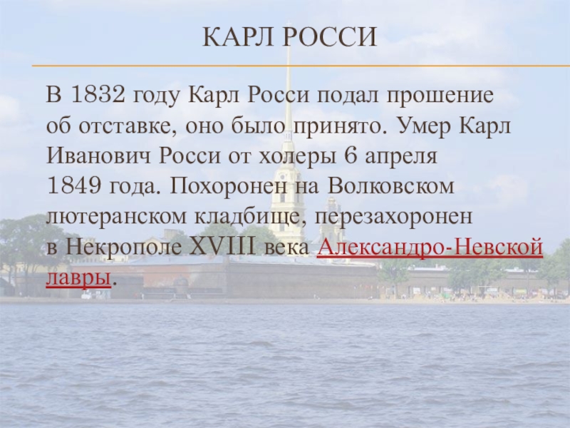 было принято. Умер Карл Иванович Росси от холеры 6 апреля 1849 года. Похоронен на Волковском лютеранском кладбище, перезахоронен в Некрополе XVIII века Александро-Невской лавры.