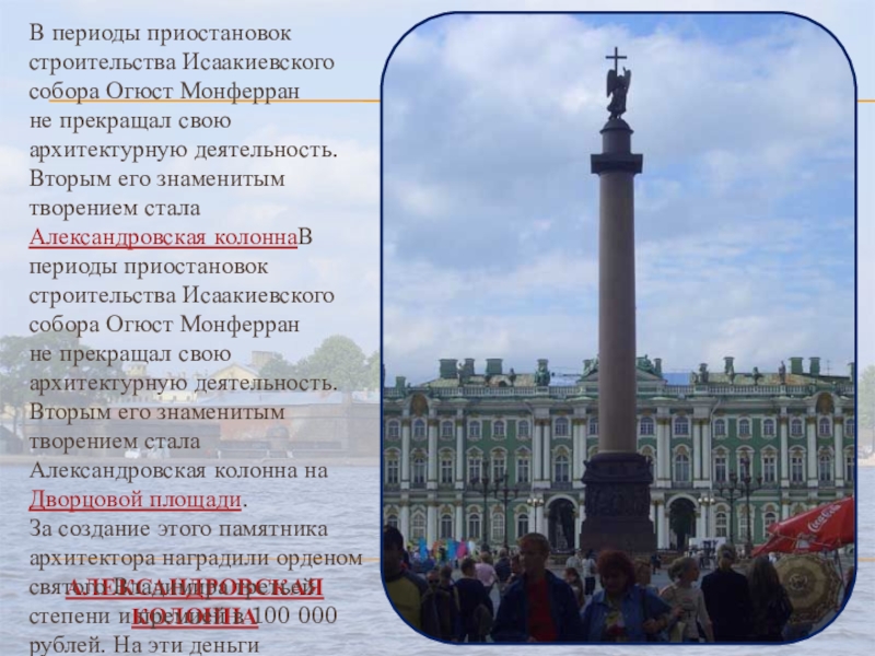 архитектурную деятельность. Вторым его знаменитым творением стала Александровская колоннаВ периоды приостановок строительства Исаакиевского собора Огюст Монферран не прекращал свою архитектурную деятельность. Вторым его знаменитым творением стала Александровская колонна на Дворцовой площади. За создание этого памятника архитектора наградили орденом святого Владимира третьей степени и премией в 100 000 рублей. На эти деньги Монферран приобрёл дом, в котором жил до своей смерти (наб. р. Мойки, 86).