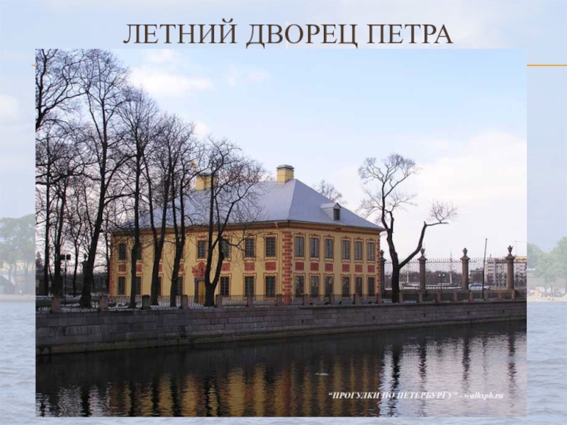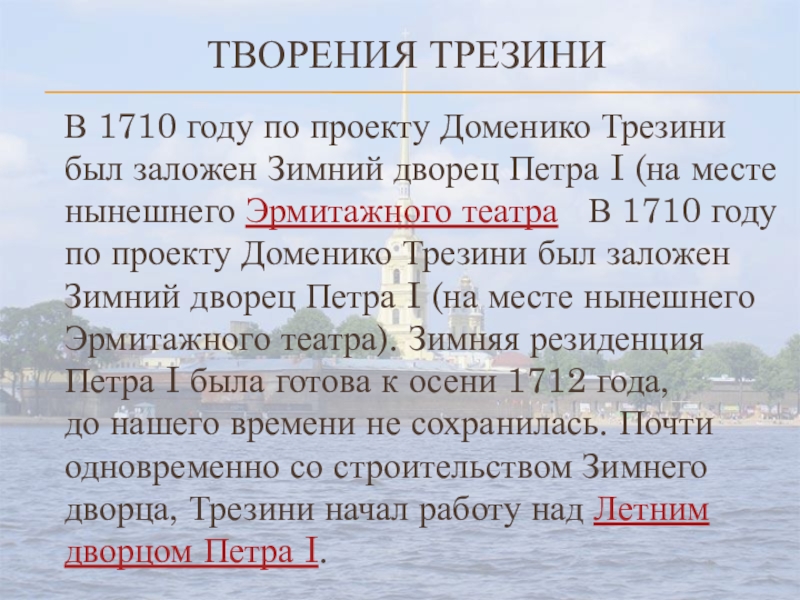 Зимний дворец Петра I (на месте нынешнего Эрмитажного театра В 1710 году по проекту Доменико Трезини был заложен Зимний дворец Петра I (на месте нынешнего Эрмитажного театра). Зимняя резиденция Петра I была готова к осени 1712 года, до нашего времени не сохранилась. Почти одновременно со строительством Зимнего дворца, Трезини начал работу над Летним дворцом Петра I.