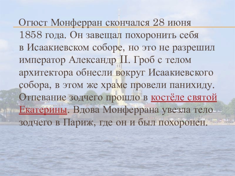 соборе, но это не разрешил император Александр II. Гроб с телом архитектора обнесли вокруг Исаакиевского собора, в этом же храме провели панихиду. Отпевание зодчего прошло в костёле святой Екатерины. Вдова Монферрана увезла тело зодчего в Париж, где он и был похоронен.