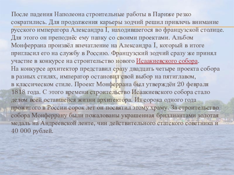 Для продолжения карьеры зодчий решил привлечь внимание русского императора Александра I, находившегося во французской столице. Для этого он преподнёс ему папку со своими проектами. Альбом Монферрана произвёл впечатление на Александра I, который в итоге пригласил его на службу в Россию. Французский зодчий сразу же принял участие в конкурсе на строительство нового Исаакиевского собора. На конкурсе архитектор представил сразу двадцать четыре проекта собора в разных стилях, император остановил свой выбор на пятиглавом, в классическом стиле. Проект Монферрана был утверждён 20 февраля 1818 года. С этого времени строительство Исаакиевского собора стало делом всей оставшейся жизни архитектора. Из сорока одного года прожитого в России сорок лет он посвятил этому храму. За строительство собора Монферрану были пожалованы украшенная бриллиантами золотая медаль на Андреевской ленте, чин действительного статского советника и 40 000 рублей.
