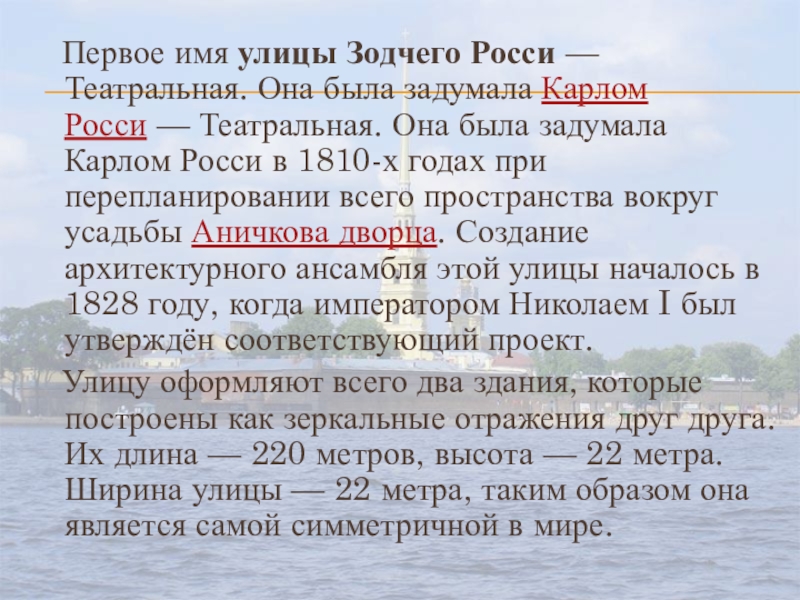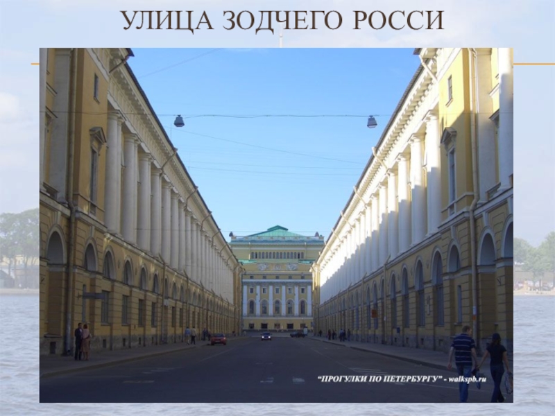 Слайд 15 Первое имя улицы Зодчего Росси — Театральная. Она была задумала Карлом