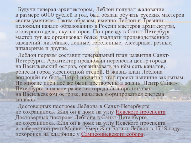 Слайд 19 Будучи генерал-архитектором, Леблон получал жалование в размере 5000 рублей в год,