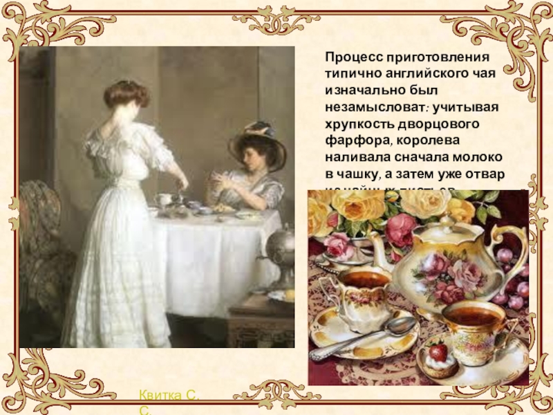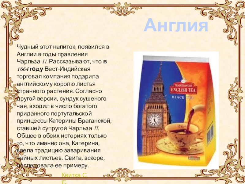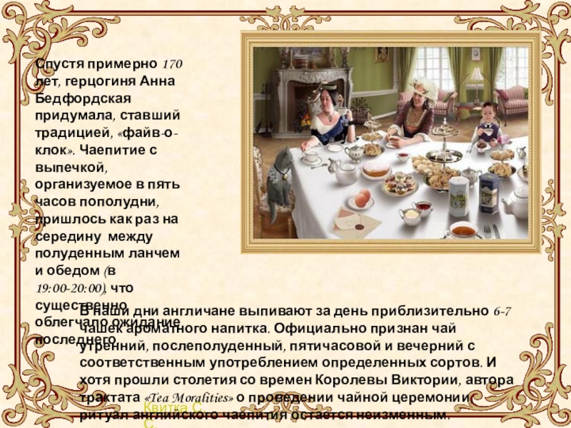 В наши дни англичане выпивают за день приблизительно 6-7 чашек ароматного напитка. Официально признан чай утренний, послеполуденный, пятичасовой и вечерний с соответственным употреблением определенных сортов. И хотя прошли столетия со времен Королевы Виктории, автора трактата «Tea Moralities» о проведении чайной церемонии, ритуал английского чаепития остается неизменным.