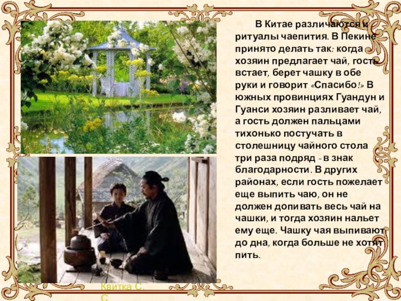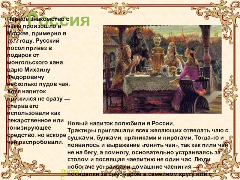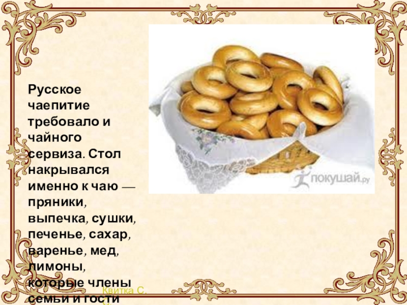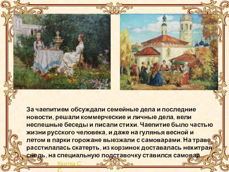 Трактиры приглашали всех желающих отведать чаю с сушками, булками, пряниками и пирогами. Тогда-то и появилось и выражение «гонять чаи», так как пили чай не на бегу, а помногу, основательно устраиваясь за столом и посвящая чаепитию не один час. Люди побогаче устраивали домашние чаепития — посиделки за самоваром в семейном кругу или с гостями.