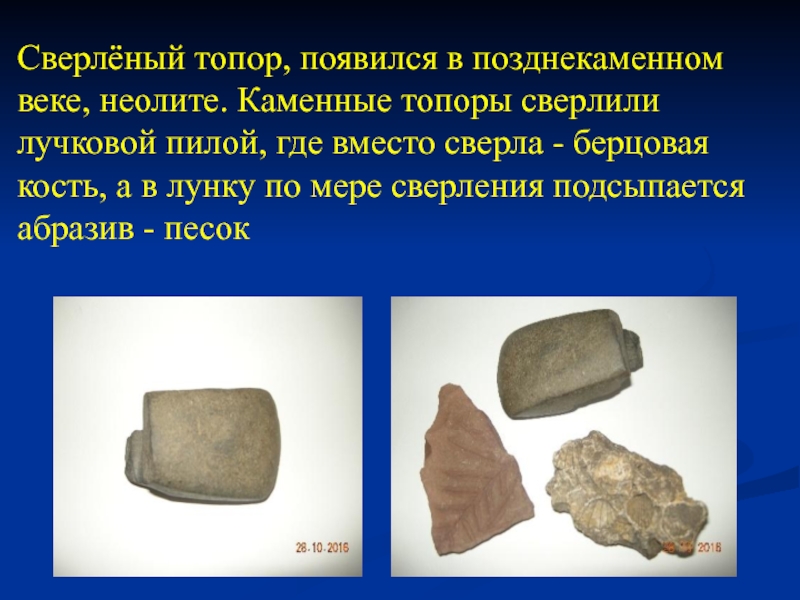 Слайд 10Сверлёный топор, появился в позднекаменном веке, неолите. Каменные топоры сверлили лучковой
