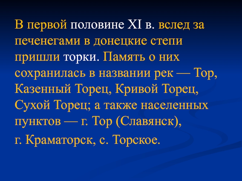 пришли торки. Память о них сохранилась в названии рек — Тор, Казенный Торец, Кривой Торец, Сухой Торец; а также населенных пунктов — г. Тор (Славянск),