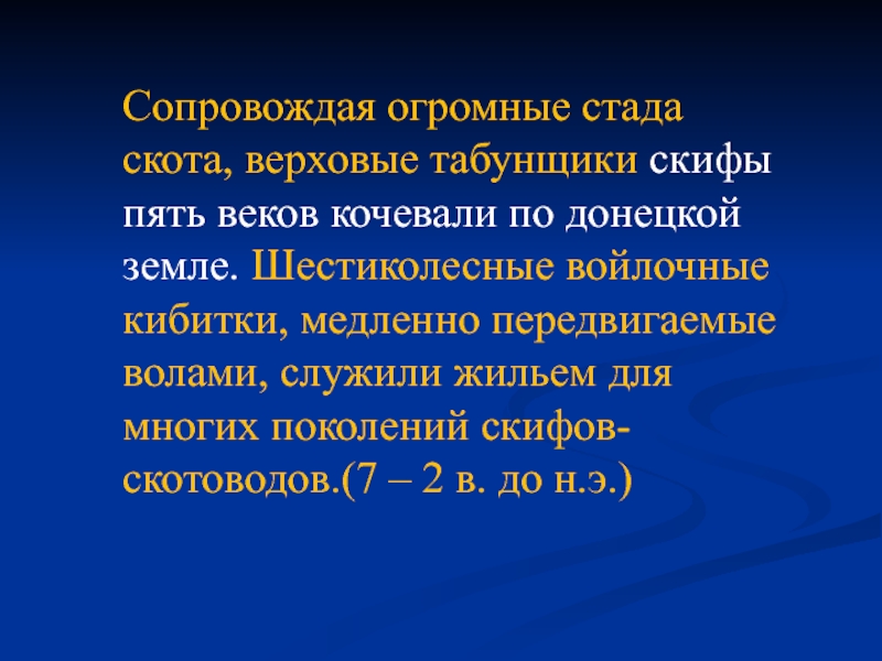 табунщики скифы пять веков кочевали по донецкой земле. Шестиколесные войлочные кибитки, медленно передвигаемые волами, служили жильем для многих поколений скифов-скотоводов.(7 – 2 в. до н.э.)
