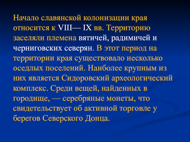 племена вятичей, радимичей и черниговских северян. В этот период на территории края существовало несколько оседлых поселений. Наиболее крупным из них является Сидоровский археологический комплекс. Среди вещей, найденных в городище, — серебряные монеты, что свидетельствует об активной торговле у берегов Северского Донца.