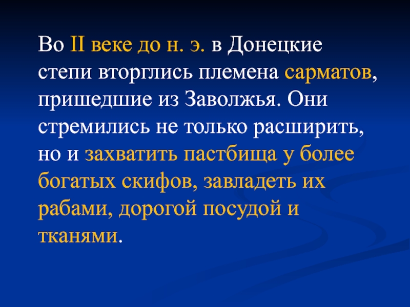 э. в Донецкие степи вторглись племена сарматов, пришедшие из Заволжья. Они стремились не только расширить, но и захватить пастбища у более богатых скифов, завладеть их рабами, дорогой посудой и тканями.