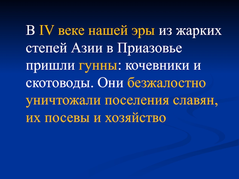 из жарких степей Азии в Приазовье пришли гунны: кочевники и скотоводы. Они безжалостно уничтожали поселения славян, их посевы и хозяйство