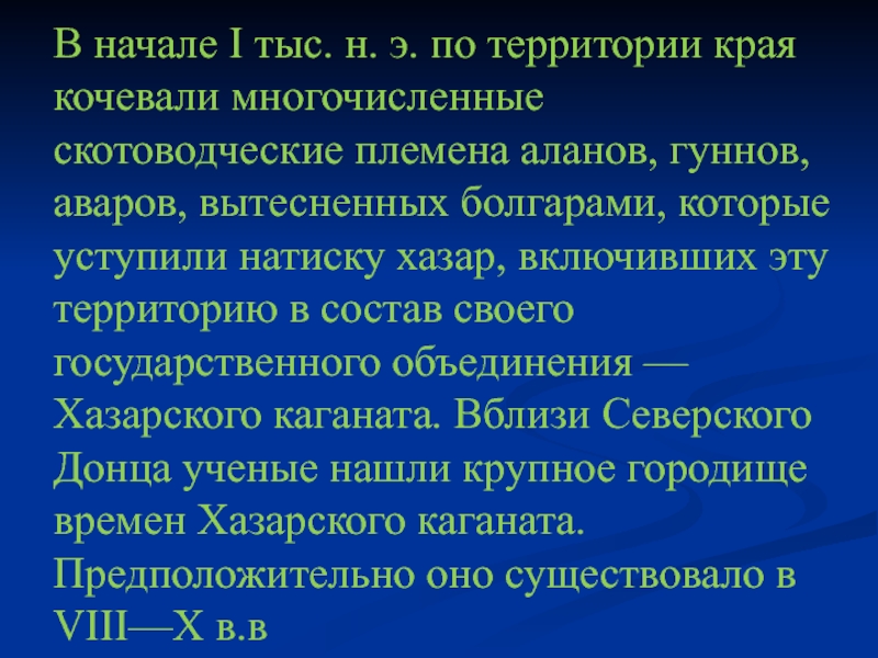 э. по территории края кочевали многочисленные скотоводческие племена аланов, гуннов, аваров, вытесненных болгарами, которые уступили натиску хазар, включивших эту территорию в состав своего государственного объединения — Хазарского каганата. Вблизи Северского Донца ученые нашли крупное городище времен Хазарского каганата. Предположительно оно существовало в VIII—X в.в