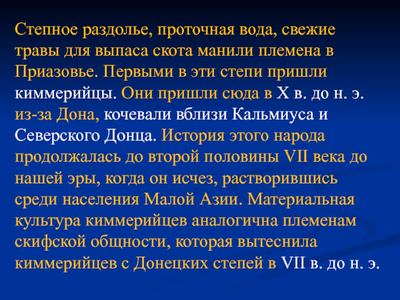 травы для выпаса скота манили племена в Приазовье. Первыми в эти степи пришли киммерийцы. Они пришли сюда в Х в. до н. э. из-за Дона, кочевали вблизи Кальмиуса и Северского Донца. История этого народа продолжалась до второй половины VII века до нашей эры, когда он исчез, растворившись среди населения Малой Азии. Материальная культура киммерийцев аналогична племенам скифской общности, которая вытеснила киммерийцев с Донецких степей в VII в. до н. э.
