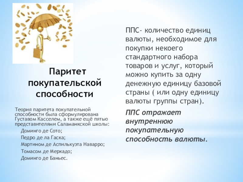 Теория паритета покупательной способности была сформулирована Густавом Касселем, а также ещё пятью представителями Саламанкской школы: