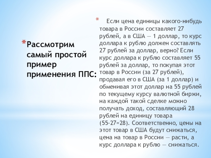 ППС- количество единиц валюты, необходимое для покупки некоего стандартного набора товаров и услуг, который можно купить за одну денежную единицу базовой страны ( или одну единицу валюты группы стран).