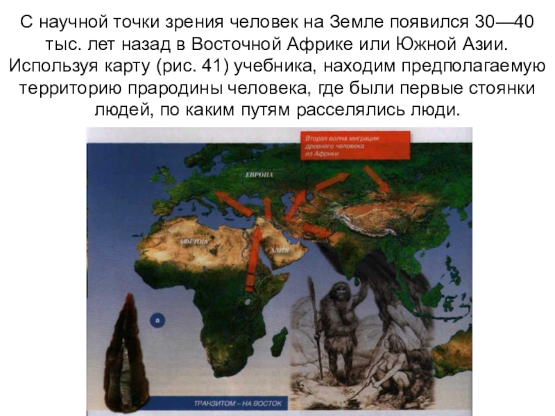 лет назад в Восточной Африке или Южной Азии. Используя карту (рис. 41) учебника, находим предполагаемую территорию прародины человека, где были первые стоянки людей, по каким путям расселялись люди.