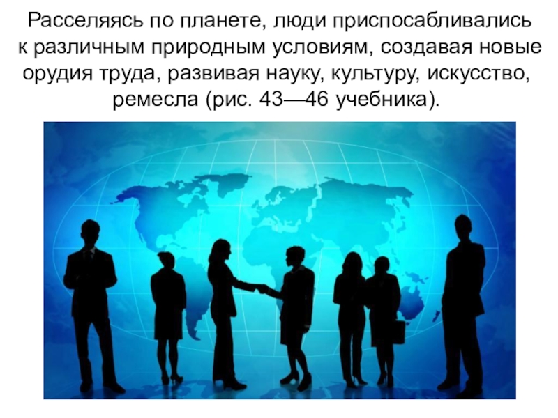 Расселяясь по планете, люди приспосабливались к различным природным условиям, создавая новые орудия труда, развивая науку, культуру, искусство,