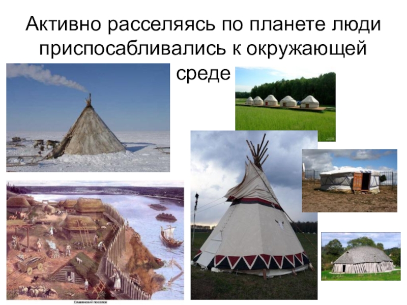 Слайд 16 Расселяясь по планете, люди приспосабливались к различным природным условиям, создавая новые