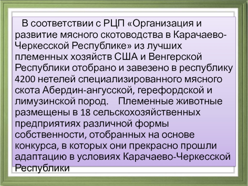 в Карачаево-Черкесской Республике» из лучших племенных хозяйств США и Венгерской Республики отобрано и завезено в республику 4200 нетелей специализированного мясного скота Абердин-ангусской, герефордской и лимузинской пород. Племенные животные размещены в 18 сельскохозяйственных предприятиях различной формы собственности, отобранных на основе конкурса, в которых они прекрасно прошли адаптацию в условиях Карачаево-Черкесской Республики