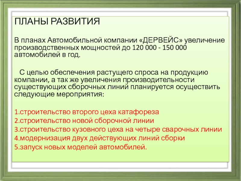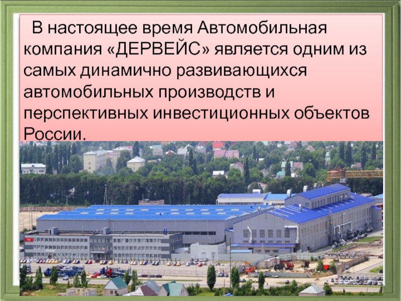 Слайд 20 В настоящее время Автомобильная компания «ДЕРВЕЙС» является одним из самых