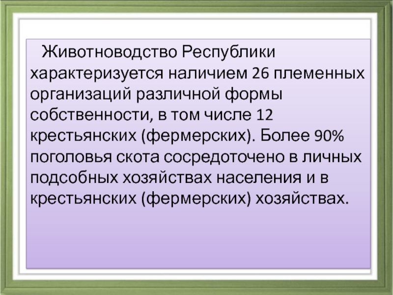 Слайд 8 Животноводство Республики характеризуется наличием 26 племенных организаций различной формы