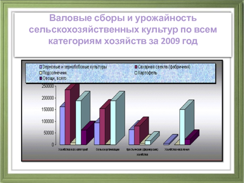 Слайд 7Валовые сборы и урожайность сельскохозяйственных культур по всем категориям хозяйств за