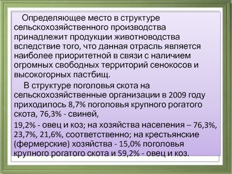 Слайд 9 Определяющее место в структуре сельскохозяйственного производства принадлежит продукции животноводства