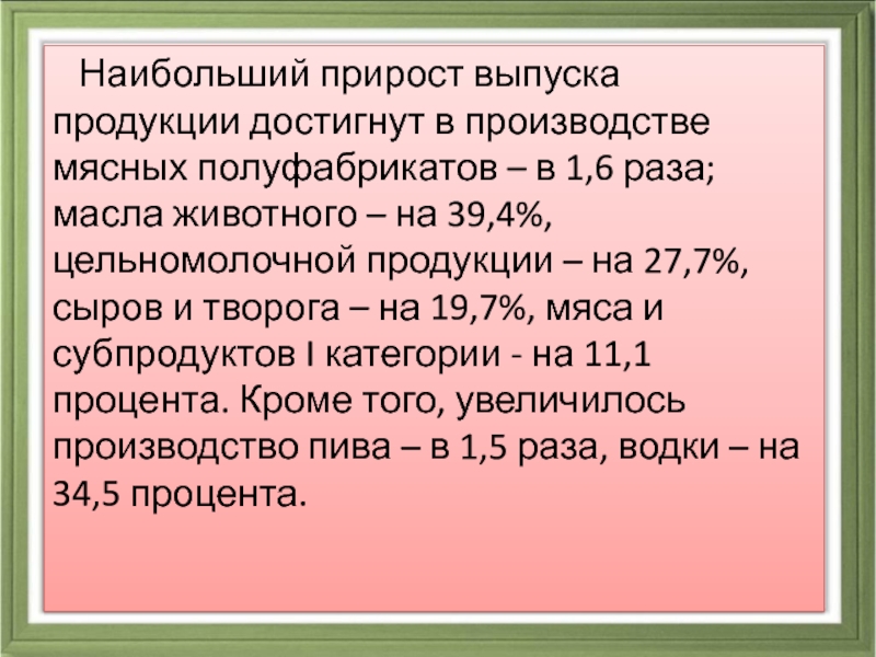 Слайд 14 Наибольший прирост выпуска продукции достигнут в производстве мясных полуфабрикатов