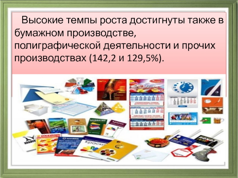 Слайд 15 Высокие темпы роста достигнуты также в бумажном производстве, полиграфической
