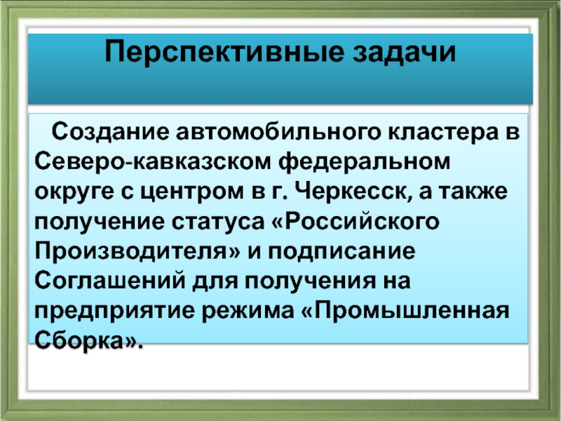 центром в г. Черкесск, а также получение статуса «Российского Производителя» и подписание Соглашений для получения на предприятие режима «Промышленная Сборка».