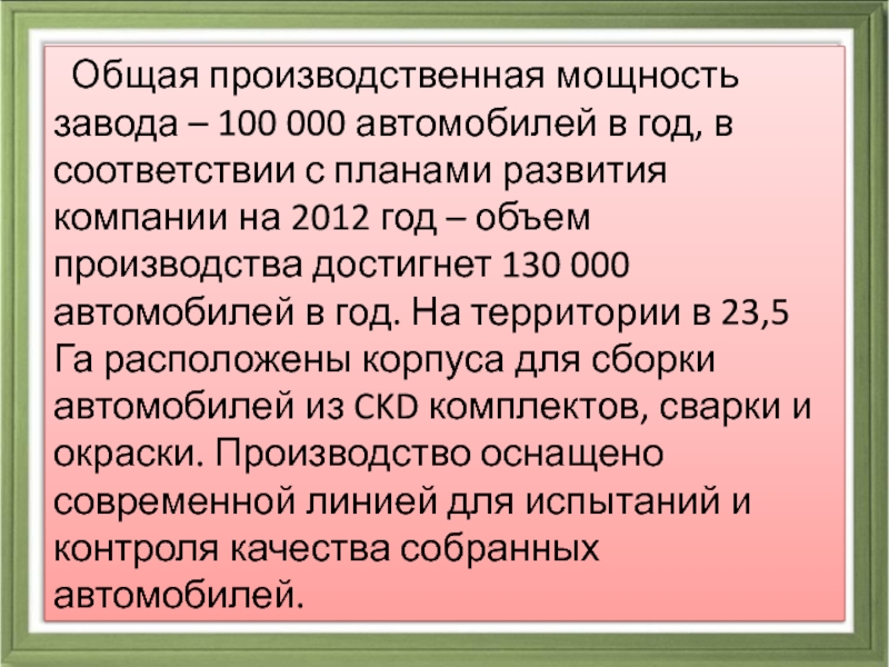 в соответствии с планами развития компании на 2012 год – объем производства достигнет 130 000 автомобилей в год. На территории в 23,5 Га расположены корпуса для сборки автомобилей из CKD комплектов, сварки и окраски. Производство оснащено современной линией для испытаний и контроля качества собранных автомобилей.