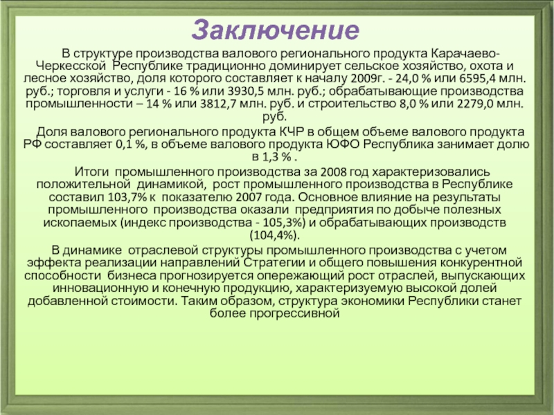 Доля валового регионального продукта КЧР в общем объеме валового продукта РФ составляет 0,1 %, в объеме валового продукта ЮФО Республика занимает долю в 1,3 % .