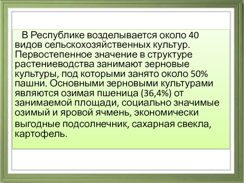 Слайд 3 В Республике возделывается около 40 видов сельскохозяйственных культур.