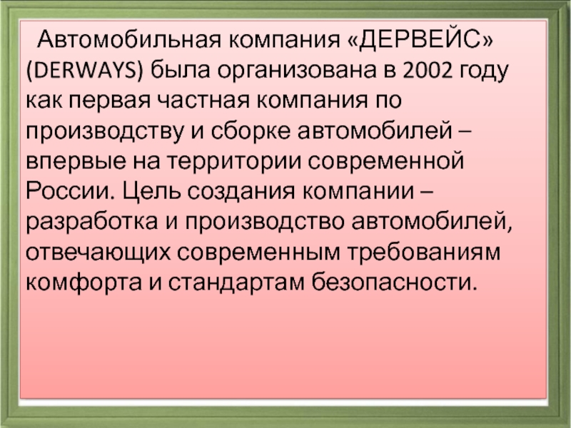 Слайд 18 Автомобильная компания «ДЕРВЕЙС» (DERWAYS) была организована в 2002 году как