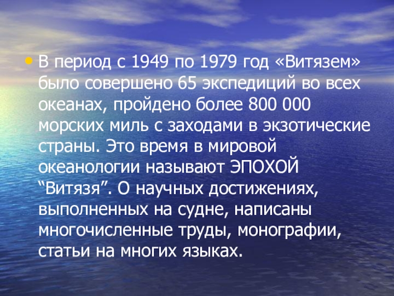 экспедиций во всех океанах, пройдено более 800 000 морских миль с заходами в экзотические страны. Это время в мировой океанологии называют ЭПОХОЙ “Витязя”. О научных достижениях, выполненных на судне, написаны многочисленные труды, монографии, статьи на многих языках.